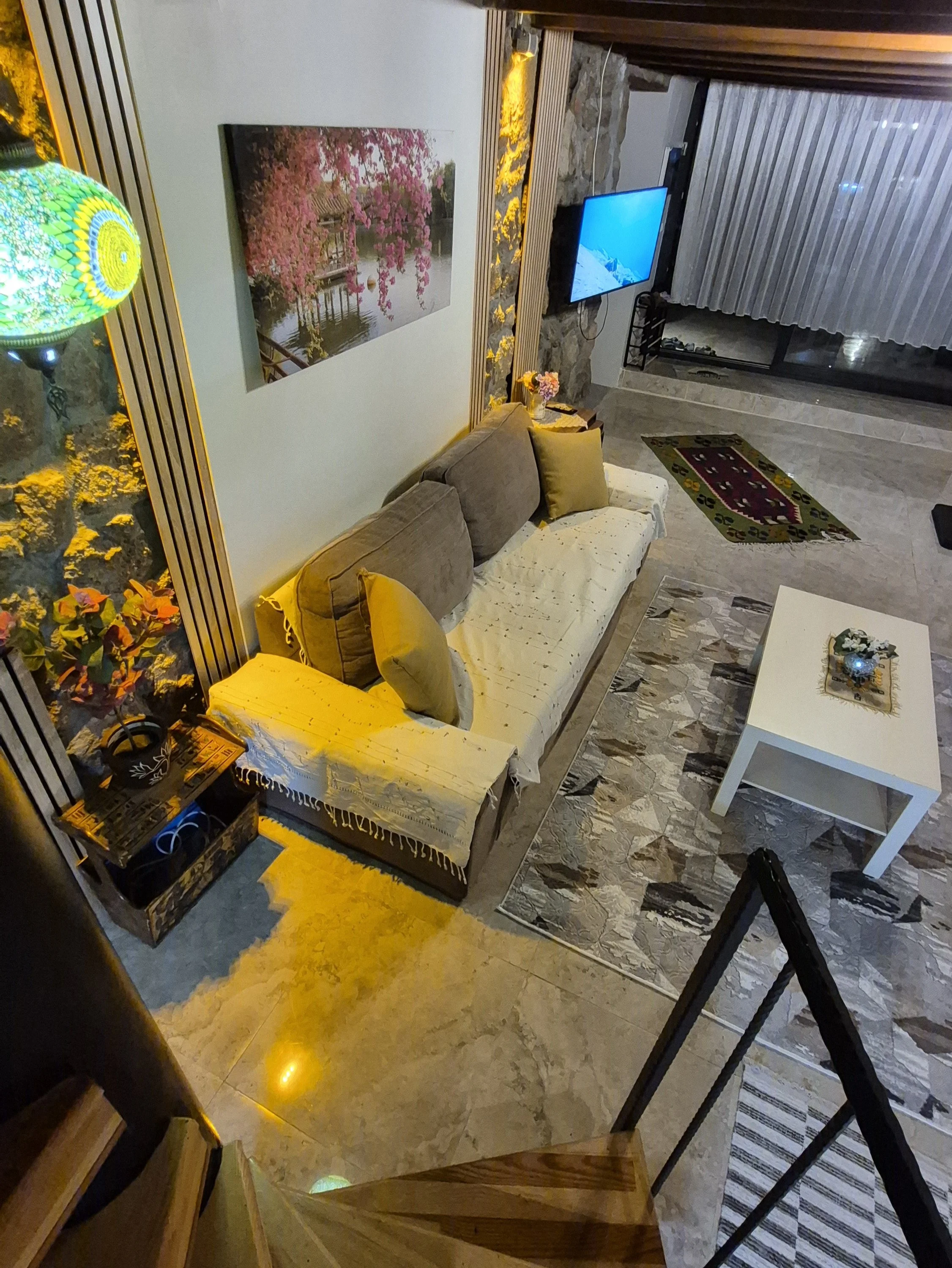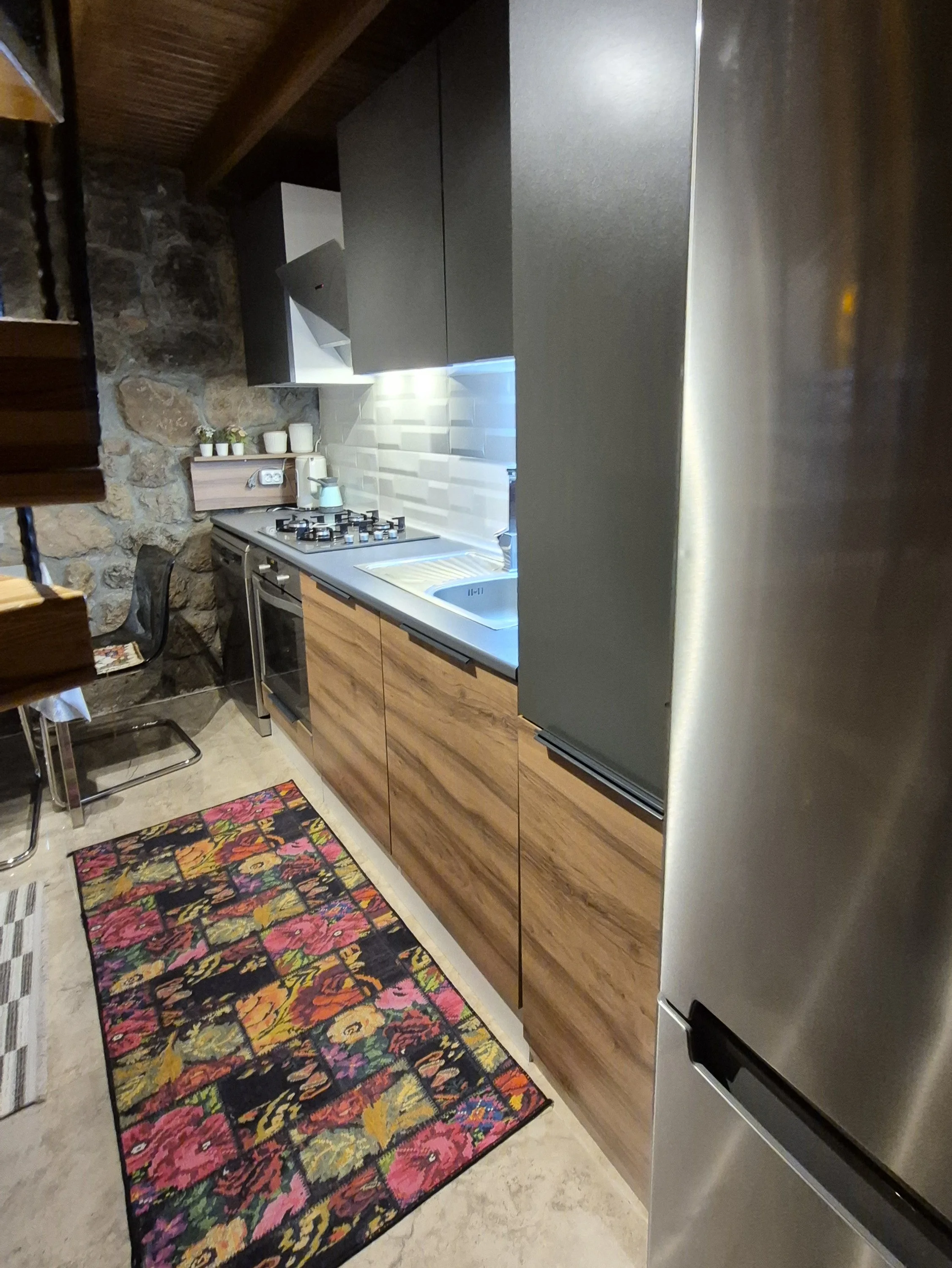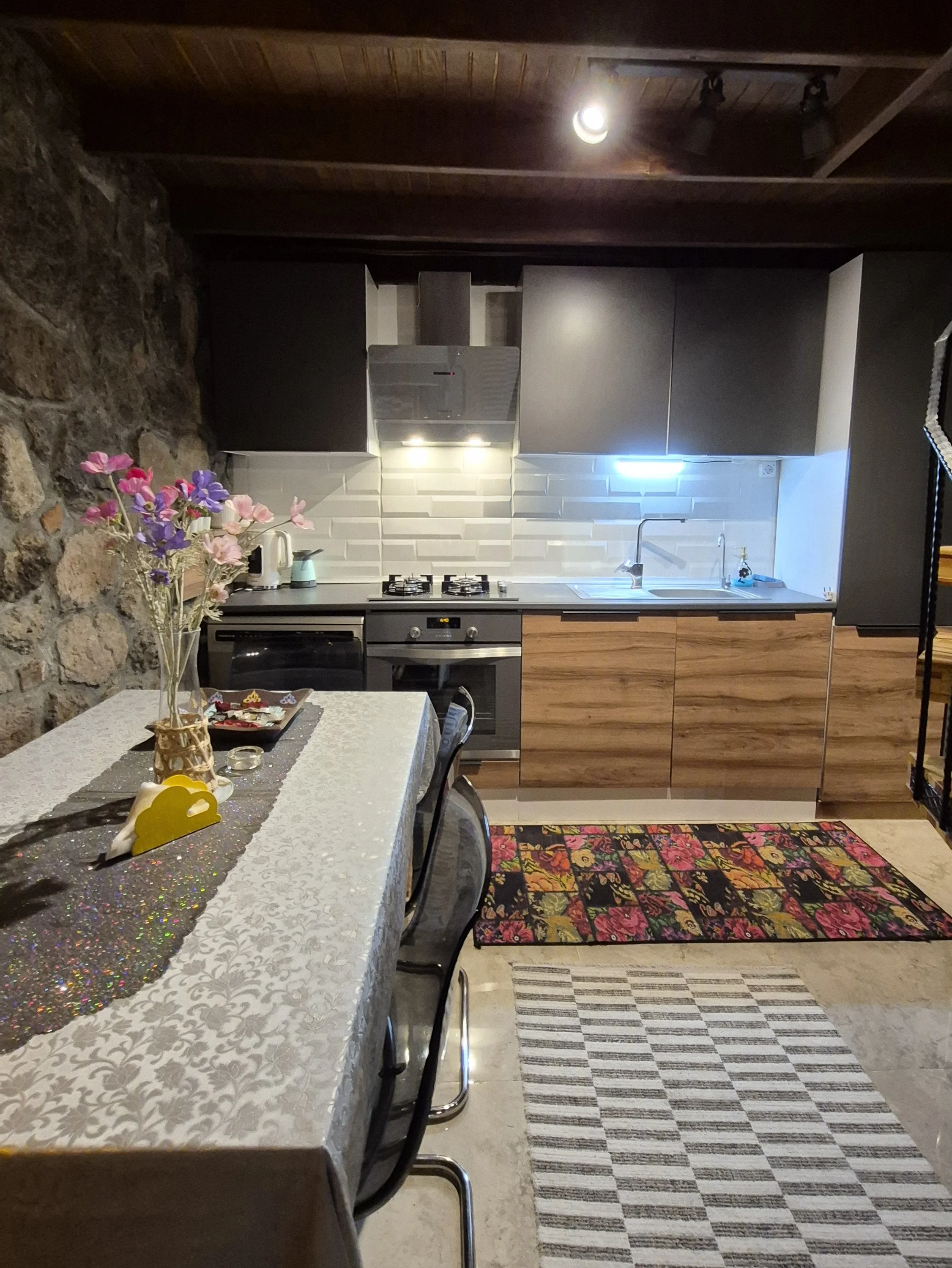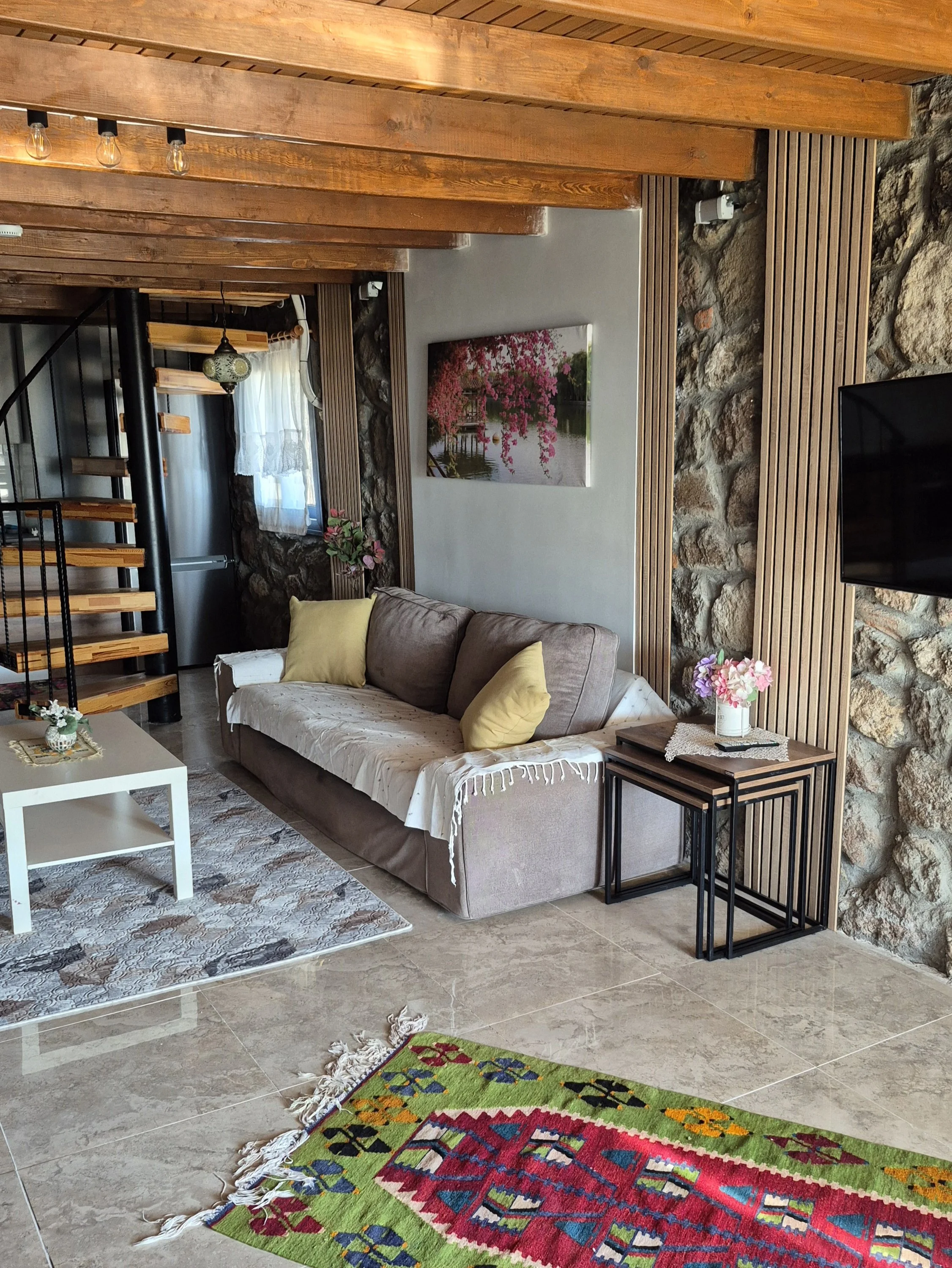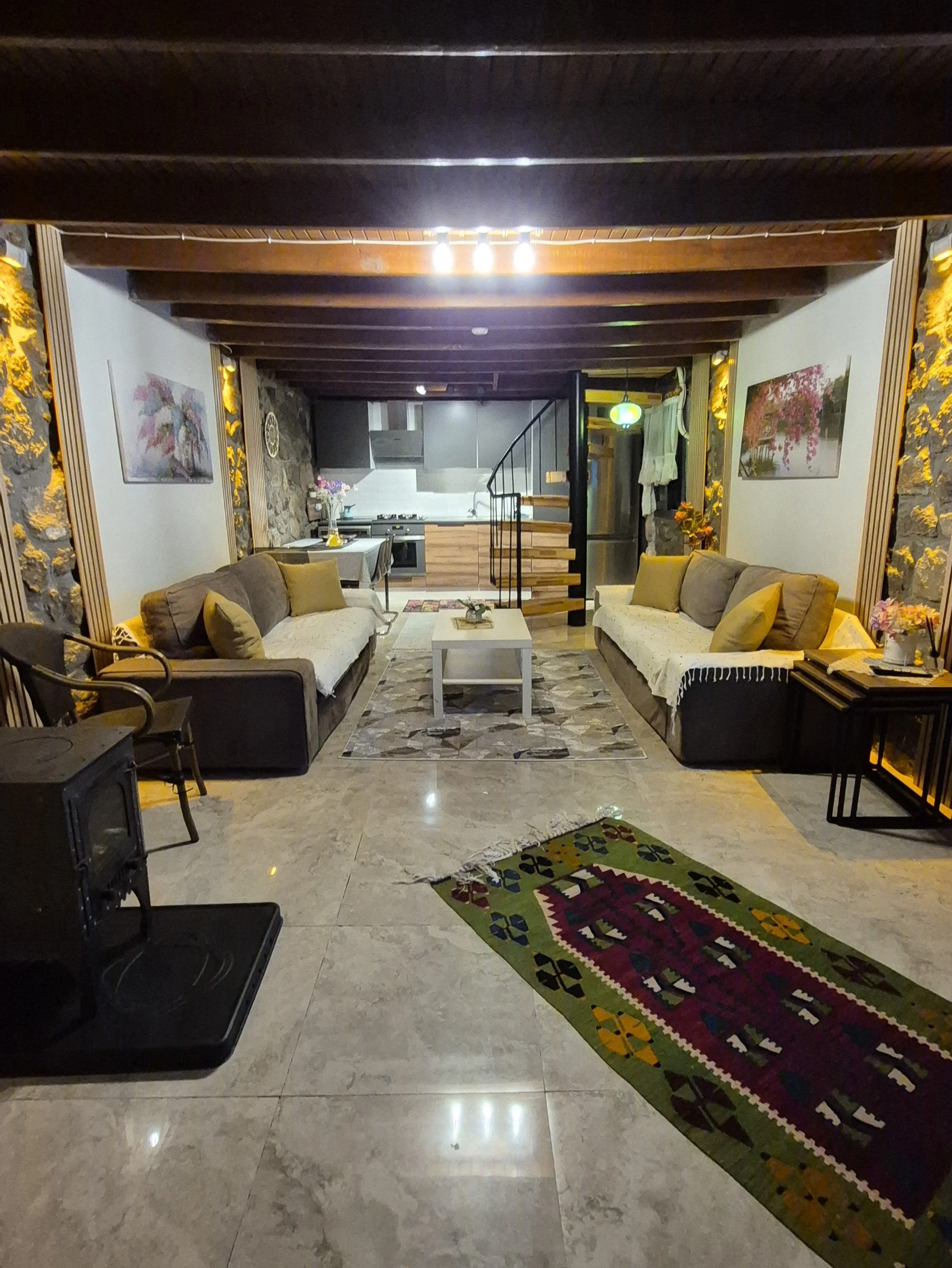Alt katta; Açık mutfak salon, Perguleli veranda, banyo WC